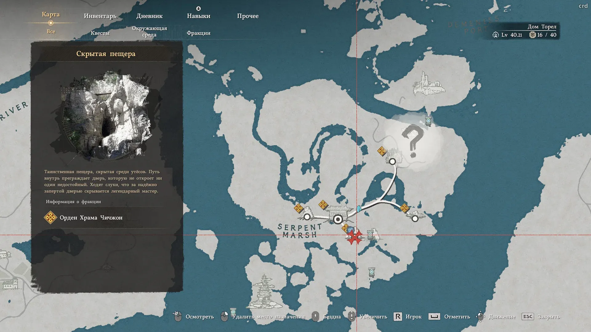 Дальше дорога на юг, в Деменисс. Ведьма поселилась на острове у Змеиного болота, возле телепорта. Кстати, если вы не любите забегать вперёд — не переживайте. Девятая глава сама отправит вас в эти края, и встречи не избежать.