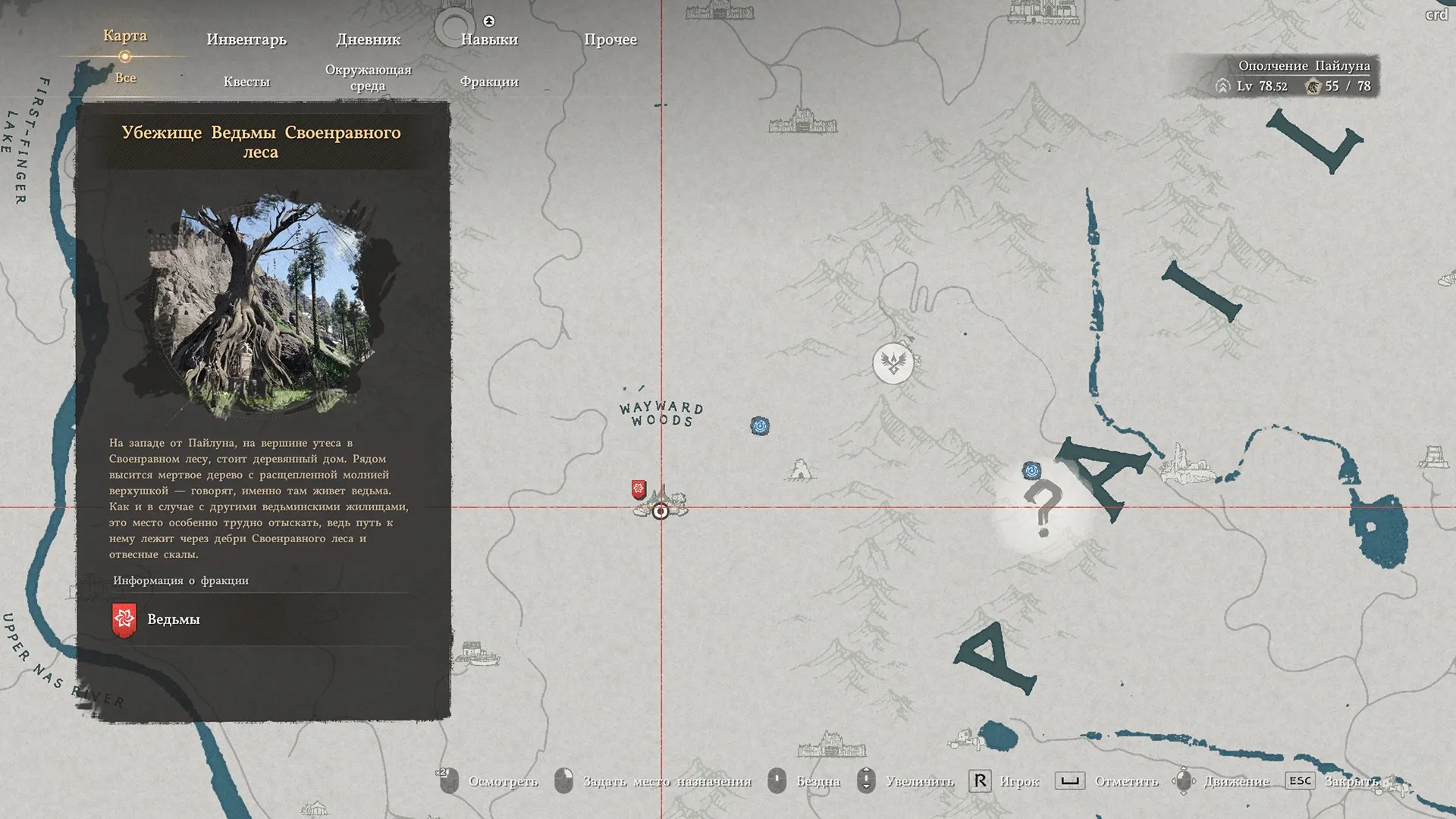Игра сама подскажет, что рядом кто-то нуждается в помощи. Отыщите этого персонажа, зажгите жаровню и поговорите с ведьмой. Она расскажет, где её настоящий дом — идти примерно километр на север, к Багровому озеру. Там и получите задание. Заодно активируйте телепорт на горе позади дома — пригодится.